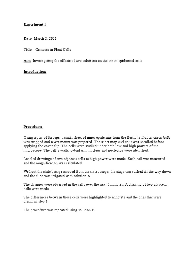 Osmosis in plants plants depend on osmosis to move water from their roots to their leaves. Cell homeostasis virtual lab what happens to a cell when it is in different environments? [i made a mistake in calculating percent change. The below mentioned article includes a list of four simple experiments on osmosis. The following content was provided by scott a.